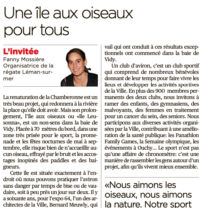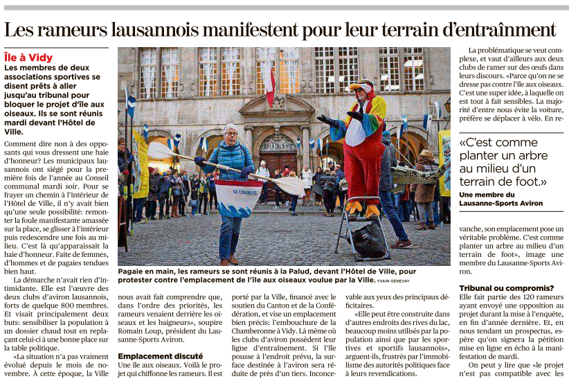 De nombreuses et nombreux membres des clubs d'aviron lausannois se sont mobilisés pour signifier leurs inquiétudes face au projet de construction d'une île aux oiseaux au centre de leur stade de rame. Femmes, hommes, jeunes, adultes, seniors, tant les adeptes de la compétition que du sport loisirs se sont rassemblés.
